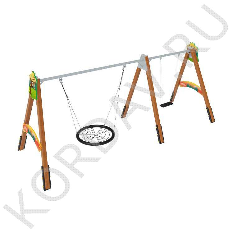 Сиденье «Гнездо»Диаметр сиденья — 1000 мм. Плетение внутри кольца выполнено из четырёхпрядного армированного каната диаметром 16 мм. Качели комплектуются подвесами из шестипрядного армированного каната. Длина подвесов — 1340 мм. Подвес из цепи. Цепь: короткозвеньевая, не калиброванного класса, прочность металла Т(8), диаметр сечения звена цепи 6 мм. Цепи соединены в единый подвес наконечником для крепления к перекладине качели. Наконечник выполнен из втулки с подшипниками и скобы.